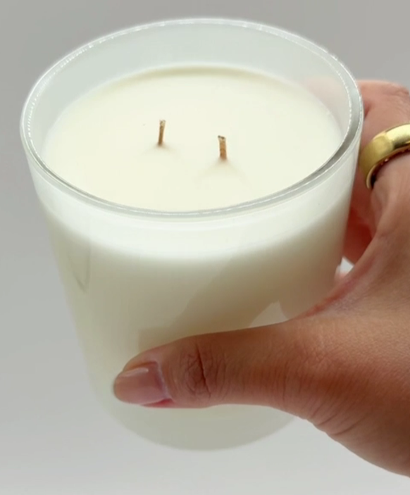12 oz Translucent White Jar Bronze or Plastic Lid. Double Wicked.