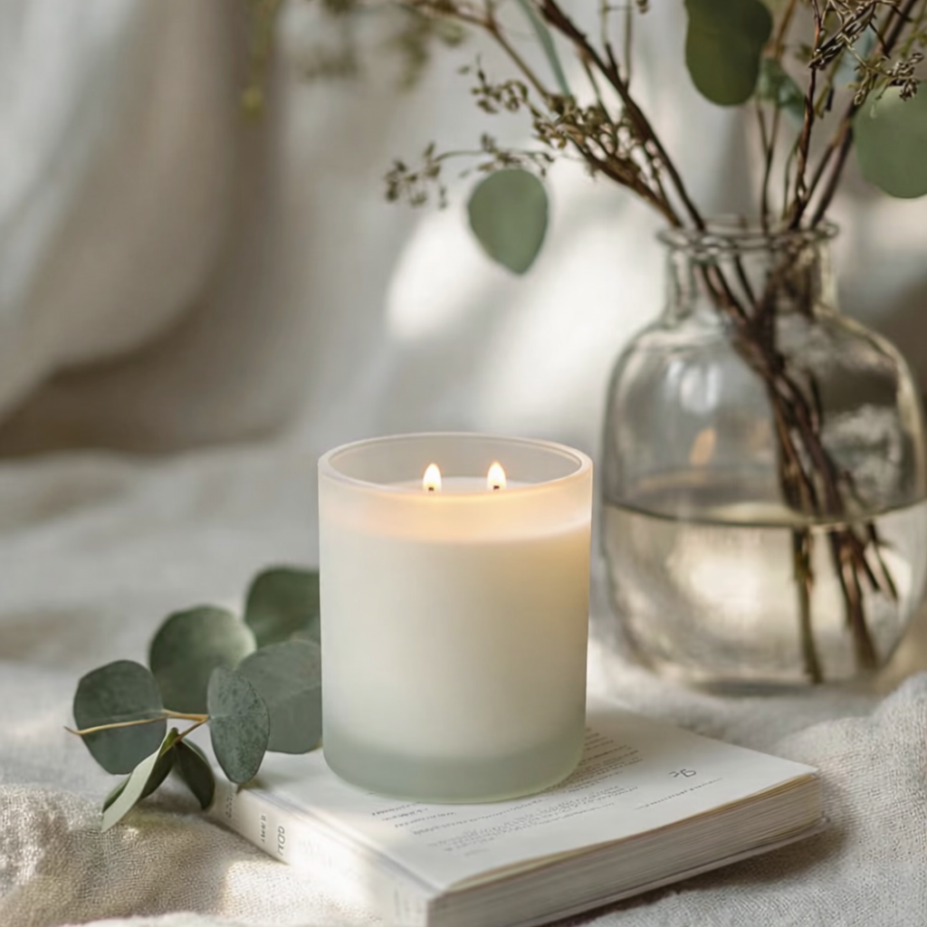 12 oz Double Wicked White Frosted Translucent Jar with Bamboo Lid.